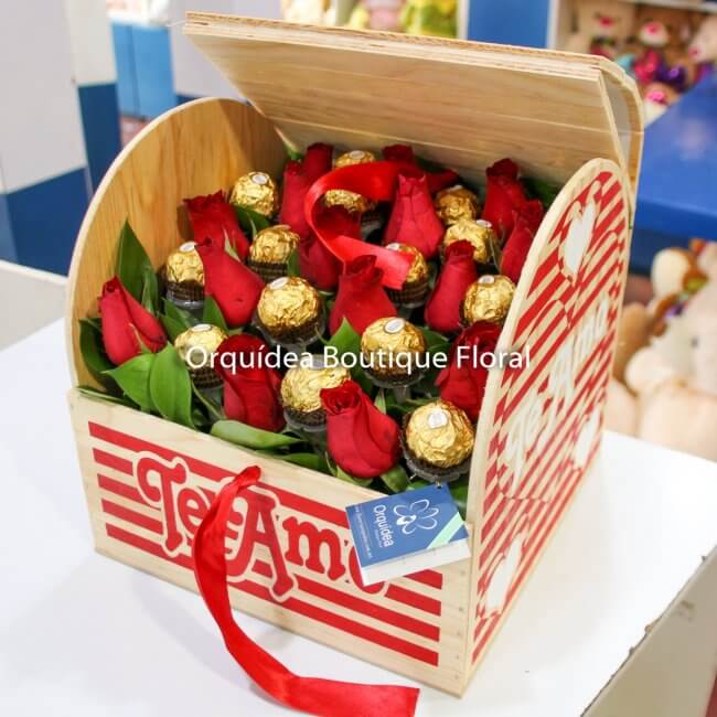 Sorprende con este original regalo floral de 13 rosas y 12 chocolates ferrero dentro de un baúl de madera.